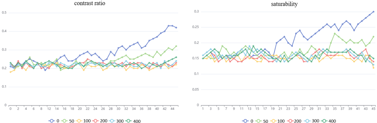 The Saturation metric is computed by converting images to HSV and averaging the mean saturation channel values across all frames. A higher value indicates oversaturation.
